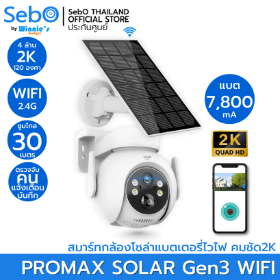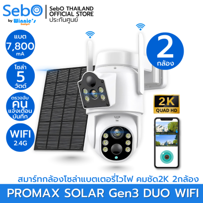 SebO PROMAX SOLAR Gen3 DUO WIFI สมาร์ทกล้องวงจรปิด 2กล้อง กว้างและหมุนได้ พร้อมแผงโซล่าเชื่อมไวไฟ 2.4G พร้อมแบต 7800mA ใช้งานนาน 20 ชม. - 30 วัน คมชัดระดับ 4M ซูมไกล 30 เมตร แจ้งเตือนคนพร้อมระบบไซเลนและบันทึก ดูสดและย้อนหลังฟรี