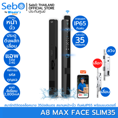 SebO JIDOOR A8 MAX FACE SLIM35 สมาร์ทดิจิตอลล็อค ที่บางแบบประตูตู้เย็น รุ่นพิเศษสำหรับด้านในติดมุ้ง บางเพียง 35 มิล โดนฝนได้ IP65 พร้อมกล้องตาแมวออนไลน์ ดู สนทนา สั่งเปิดบนแอพไวไฟ เปิดด้วยใบหน้า นิ้ว การ์ด แอพไวไฟ พร้อมกุญแจสำรองและช่องชาร์จสำรอง