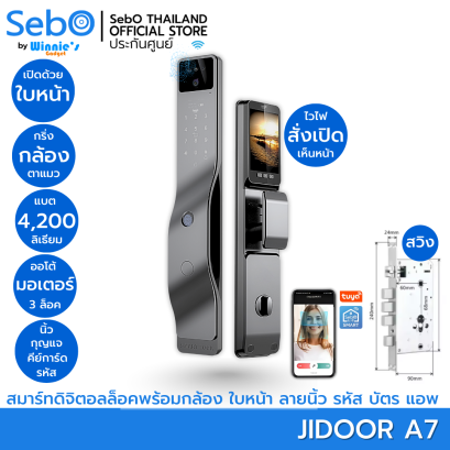 SebO JIDOOR A7 สมาร์ทล็อคประตูแบบมือจับที่เรียบหรูบนประตูดึงผลัก สั่งเปิดด้วยใบหน้า ลายนิ้ว บัตร รหัส กุญแจสำรอง ตาแมวพร้อมจอขนาดใหญ่ และแอพกล้องไวไฟสั่งเปิด พร้อมดูผ่านมือถือจากนอกบ้านได้ ปลอดภัยด้วยระบบล็อค 3 ชั้น