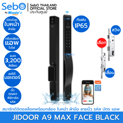 SebO JIDOOR A9 MAX FACE สมาร์ทล็อคประตูแบบมือจับที่หรูเรียบที่สุด พร้อมกริ่งและกล้อง ใช้ได้ทุกประตูดึงผลักและเลื่อน โดนฝนได้ทั้งนอกและใน สั่งเปิดด้วยใบหน้า ฝ่ามือ ลายนิ้ว บัตร รหัส กุญแจสำรอง และแอพไวไฟ