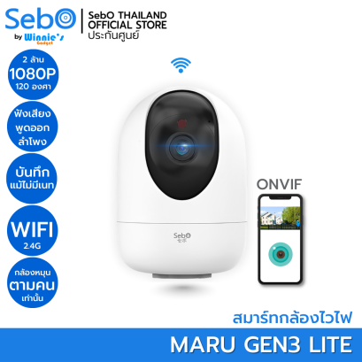 SebO MARU Gen3 Lite กล้องไร้สายภายนอกระดับ 2ล้าน FullHD สำหรับภายใน แจ้งเตือนคน หมุนติดตาม ดูสดและย้อนหลังฟรี พร้อมระบบไซเล ความละเอียดกล้อง 2 ล้าน 1980x1080P 2.8 มม. 120องศา อินฟราเรด 4 ไฟช่วยส่อง 4 ดวง หมุนได้ 350 องศา ก้มเงย 60 องศา หมุนติดตามเฉพาะคน และกลับตำแหน่งล่าสุด บันทึกเมื่อไม่มีเนท ดิจิตอลซูม 4x กลางวัน 20 เมตร กลางคืน 10 เมตร แจ้งเตือน แบบไซเลน ดัง 90dB แจ้งเตือนแบบต้อนรับ เชื่อมต่อ ONVIF ได้ บันทึกลง HDD ในกล่องบันทึกได้และต่อทีวีดูได้ เชื่อมต่อ Alexa ได้ เชื่อมต่อ Wifi 2.4G เสาแบบซ่อน บันทึกบนเมม 128Gb. 10วัน - 300 วันขึ้นกับการตั้งค่า ตั้งความละเอียดบันทึกได้ มีแถบแจ้งเตือนเมื่อเจอคน ง่ายเมื่อดูย้อนหลัง ดูย้อนหลังผ่านคลาวด์(เดือนละ 69 บาท)ดูย้อนได้เมื่อกล้องหายหรือถูกทำลาย ตั้งโซนแจ้งเตือนเองบนจอได้ ตั้งโหมดกลางคืนภาพสี 24 ชม. ส่องไฟ 4 ดวง ตั้งโหมดขาวดำ อินฟรา 4 ดวง ตั้งเปิดปิดเสียง ความดังได้ ขนาด 70x70x140 มิลลิเมตร นน 300 กรัม