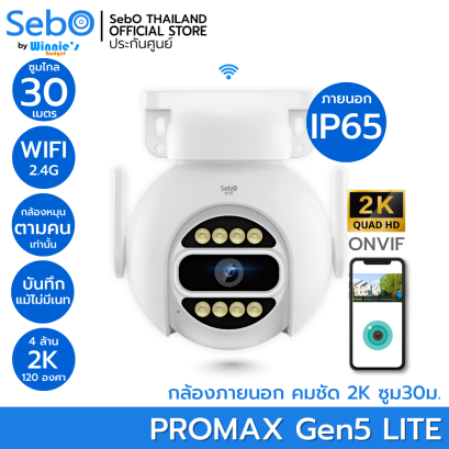 SebO PROMAX Gen5 Lite สมาร์ทกล้องไวไฟ ภายนอกกันฝน IP65 ชัด 2K แจ้งเตือน ถ่ายรูป ไซเลนดัง หมุนติดตามเมื่อเจอคน ONVIF SebO PROMAX Gen5 Lite สมาร์ทกล้องภายนอกกันฝน IP65 คมชัดระดับ 4M ซูมไกล 30 เมตร แจ้งเตือนคน หมุนติดตาม ดูสดและย้อนหลังฟรี บันทึกแม้ไม่มีเนท พร้อมระบบไซเลน ต่อ ONVIF และบันทึกบนกล่องบันทึกต่อทีวีได้ ความละเอียดกล้อง 4ล้าน 2560x1440 2.8มม. 120องศา ภายนอก IP65 กันฝนได้ หมุนติดตามเฉพาะคน และกลับตำแหน่งล่าสุด บันทึกเมื่อไม่มีเนท ซูม 8x กลางวัน 30 เมตร กลางคืน 30 เมตร แจ้งเตือน แบบไซเลน ดัง 90dB แจ้งเตือนแบบต้อนรับ บันทึกเสียงตัวเองออกลำโพงได้ พูดคุยสนทนาระหว่างแอพและกล้องได้ เชื่อมต่อ Alexa ได้ เชื่อมต่อ Wifi 2.4G เสา 5dB. เชื่อมต่อผ่านแลนได้ เชื่อมต่อ ONVIF ได้ บันทึกบนเมม 128Gb. 10วัน - 300 วันขึ้นกับการตั้งค่า ตั้งความละเอียดบันทึกได้ มีแถบแจ้งเตือนเมื่อเจอคน ง่ายเมื่อดูย้อนหลัง ดูย้อนหลังผ่านคลาวด์(มีค่าใช้จ่ายเพิ่ม)ดูย้อนได้เมื่อกล้องหายหรือถูกทำลาย ตั้งโซนแจ้งเตือนเองบนจอได้ ตั้งโหมดกลางคืนภาพสี 24 ชม. ส่องไฟ 8 ดวง ตั้งโหมดขาวดำ อินฟรา 8 ดวง ตั้งเปิดปิดเสียง ความดังได้ Google Assistance ได้เมื่อมี Google Hub เพื่อสั่งเปิดกล้องได้